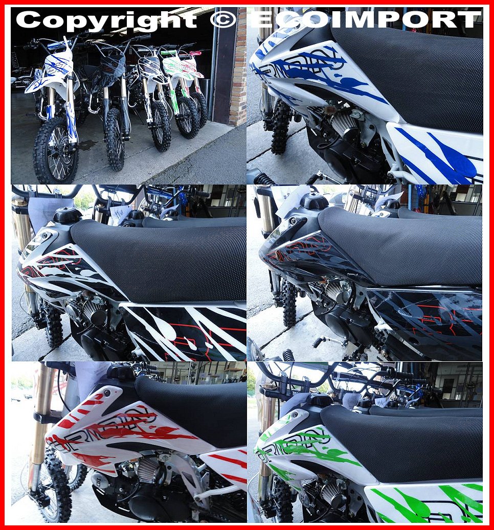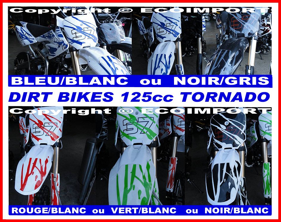 ( AUTRE PHOTOS + VIDEO EN BAS DE PAGE ) DIRT BIKE 125cc TORNADO RACING NOUVEAU Modèle ! FICHE TECHNIQUE DIRT BIKE 125 TORNADO RACIING : NOUVEAU MOTEUR HAUT DE GAMME : LIFAN 125cc NOUVEAU CADRE CROSS RENFORCE + ECHAPPEMENT SPORT + NOUVEAU GUIDON RACING PRO !!! Bras oscillant renforcé = ROBUSTE !!! Nouveau cadre poutre acier renforcé Pour Freestyle et sauts !!! Suspension avant = fourche hydraulique inversée + ressort renforcé Suspension arrière = amortisseur réglables FAST ACE Freins Hydrauliques avant + Freins Hydrauliques arrière Doubles pistons avec des durites de type aviation! > Démarrage au kick + protection de chaine Embrayage = Manuel / Transmission = 4 rapports (N-1-2-3-4) Carburation : mikuni 26mm / Bougie NGK Chaine KMC Sabot moteur ALU WBL / Pneus cross 12"/14" QINGDA Roue avant 14" avec moyeux racing rayon renforcé! Roue avant 12" avec moyeux racing rayon renforcé! Livré avec Kit déco autocollants ! SUPER QUALITE + LOOK COMPETITION ! Dirt bike moto cross (non homologué route) CE VEHICULE EST REGLEMENTAIRE AUX NORMES CEE DE SECURITE